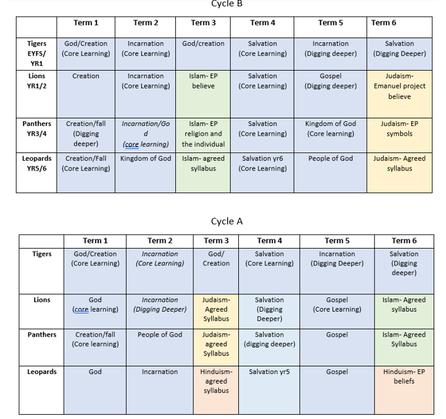 Children focus on some religions as ‘in depth’ studies and others as ‘encounter’ studies. As a Church of England school, Christianity is an ‘in depth’ study in all year groups. Through the enquiry questions, there are opportunities for children to also compare and contrast different faiths and world views so they are able to explore the enquiry question fully, providing children with a broad and balanced understanding, so they can make knowledgeable responses during their learning journey.