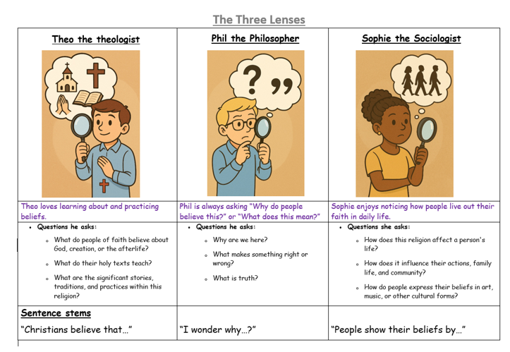 Across the year, each key phase will study and explore different religions through their enquiry questions linked to one of these disciplines.